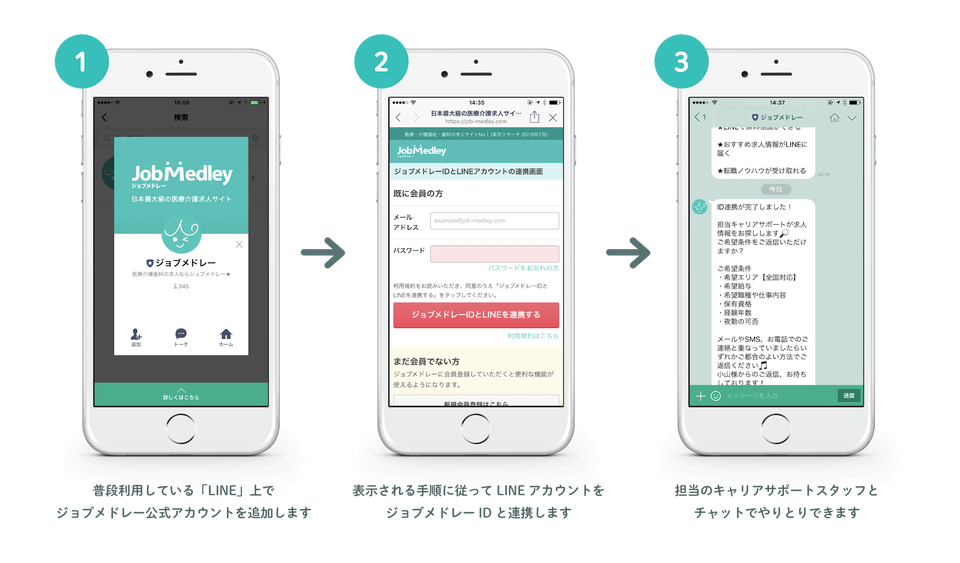 求職者は、自身のLINEアカウントとジョブメドレーの会員情報を連携させることにより、LINEのトーク画面上で、登録した経歴や希望に沿った求人情報の受け取りや、キャリアサポートスタッフへのお問い合わせなどが可能になりました。(本機能の利用は無料です)