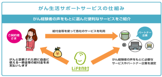 「がん生活サポートサービス」は、ライフネット生命保険株式会社が、保険会社として、給付金のお支払いのみに留まらず、がん罹患後の日常生活も支援することを目的とした新しいコンセプトのサービスです。がん罹患時に働きながら治療を続けるために、がん経験者の声に基づいて選定した便利なサービスを紹介しています。