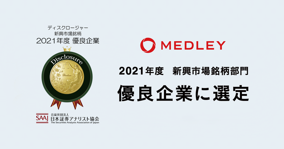 株式会社メドレー(東京都港区、代表取締役社長:瀧口浩平、以下 メドレー)は、2021年度「証券アナリストによるディスクロージャー優良企業選定」の新興市場銘柄部門において、優良企業に選定されました。