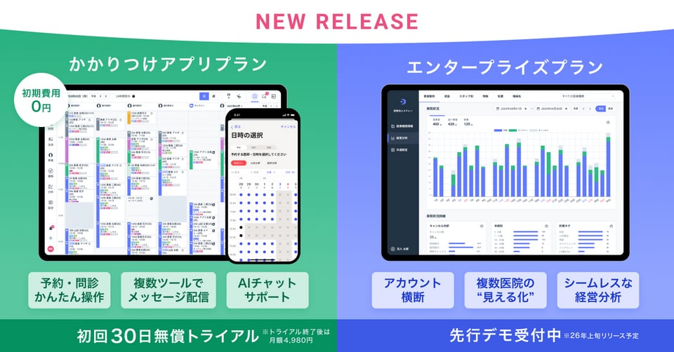 ※3 エンタープライズプランの提供開始は2026年春を予定。デモについては先行受付をします。ご利用には、最低1医院以上のかかりつけアプリプランもしくはトータル支援プランの導入が必要となります。