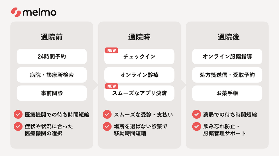 melmoは、対象医療機関の予約から問診、受付、オンライン診療、決済まで、普段の診療がスマホひとつでより便利になるアプリです。通院前から通院後に至る一連の流れにおいて、よりスムーズな医療体験を実現し、患者・生活者が抱える不便さを解消していきます(下図参照)。