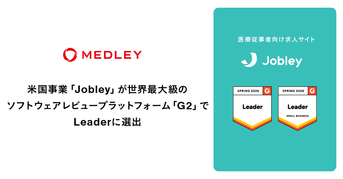 株式会社メドレー(本社:東京都港区、代表取締役社長:瀧口 浩平、以下メドレー)が米国で展開する医療求人サイト「Jobley」は、世界最大級のソフトウェアレビュープラットフォーム「G2」が発表した「Spring 2026 Grid® Report」において、Job Search Siteカテゴリーの2部門で最上位の評価である「Leader」を獲得しました。