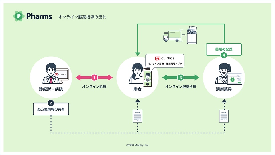 株式会社メドレー(本社:東京都港区、代表取締役医師:豊田 剛一郎、代表取締役社長:瀧口 浩平、以下「メドレー」)は、オンライン服薬指導、処方箋のネット受付、キャッシュレス決済等の機能を利用できる調剤薬局窓口支援システム「Pharms(読み:ファームス)」の提供を開始します。患者はCLINICSアプリを通じて「Pharms」導入薬局とつながり、オンライン診療とオンライン服薬指導を一気通貫で利用することが可能となります。調剤薬局からは既に全国約1,800店舗の事前申し込みがあり、オンライン診療に加え、オンライン服薬指導の全国的な普及も推進していきたいと考えています。